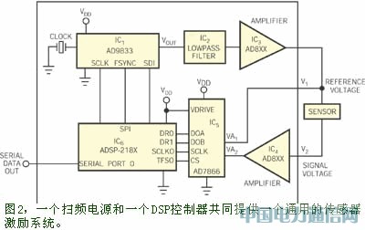 作为一种替代方法,可以使用一个跟踪传感器谐振频率变化的扫频交流电源来驱动传感器。图2示出了一种由一个DDS(直接数字合成)器件IC1来提供一正弦波激励电压的方法。低通滤波器IC2滤除时钟噪声和谐波。放大器IC3驱动传感器。放大器IC4提高传感器的输出电压V2并驱动IC5。IC5是一个双通道12位ADC,它同时对参考电压V1和IC4的输出进行采样和数字化。具有DSP功能的微控制器IC6对传感器输出的幅度和相位进行分析,并通过交替对IC1的一对频率控制寄存器进行编程来设置IC1的频率。IC6的一个串行端口把位置数据传送到外部控制器。在使用不同类型的传感器时,利用DDS/DSP组合可以提供相当好的灵活性。例如,某些传感器需要一个相对狭窄而分辨率却很高的激励频率范围,而另一些传感器则可能在宽扫频激励下发挥最佳的作用。