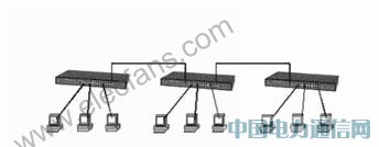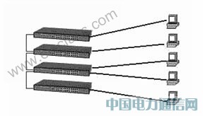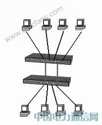 这是最常用的一种组网方式,它通过交换机上的级联口(UpLink)进行连接。需要注意的是交换机不能无限制级联,超过一定数量的交换机进行级联,最终会引起广播风暴,导致网络性能严重下降。其结构示意图如下所示。