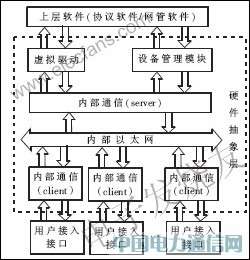 根据文献提出的方案,高性能路由器硬件抽象层可分为内部通信、虚拟驱动及设备管理三大模块,这三部分模块相互配合,共同完成面向实际的用户设备接口的功能模拟及硬件细节的屏蔽,并对其进行统一协调的管理。硬件抽象层对用户设备接口的功能模拟主要由虚拟驱动模块完成,包括数据包的收发及协议报文的预处理等工作,为上层协议软件提供标准的API函数;而对用户设备的接口管理则由上层网络管理软件通过设备管理模块对其进行管理配置及监控;内部通信模块运行于内部以太网络,协调各模块之间的功能接口,保证各从处理单元与主处理单元之间实时可靠的数据传输。其基本结构如图1所示。