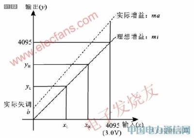 在计算机测控系统中,对象数据的采集一般包含两种基本物理量:模拟量和数字量。对于数字量计算机可以直接读取,而对于模拟量只有通过转换成数字量才能被计算机所接受,因此要实现对模拟量准确的采集及处理,模数转换的精度和准确率必须满足一定的要求。由于F2812的ADC具有一定增益误差的偏移误差,所以很容易造成系统的误操作。下面分析两种误差对线性电压输入及A/D转换结果的影响。