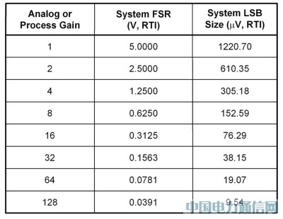 我们研究这两个系统的精确度和重复定位精度时,我们可以使用表 1 来作为开始。在表 1 中,系统增益范围为 1 到 128。表格第二列显示了理想系统的满量程范围 (FSR),其为系统的等效输入 (RTI)。最终,系统最低有效位(LSB,表格第 3 列)等于系统的 FSR,其除以系统码数 (4096)。