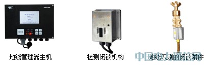 每根需要管理的地线上安装有地线识别与闭锁附件(简称附件),该附件上安装有无线码片,而每个检测闭锁机构上安装有无线码片识别电路和闭锁机构,当安装在地线上的附件挂到检测闭锁机构指定的卡位上时,检测闭锁机构上的无线码片识别电路将识别到码值,从而识别地线并能将正确的地线闭锁。