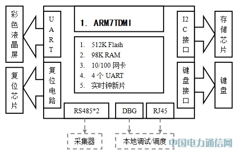 资源分配 : UART0通讯口用于本地调试或调度端上传或连接其他智能通信装置, UART1和UART2为RS485接口用于采集两组蓄电池的电压,其中UART2可用来连接其他智能通信装置(如充电机等), UART3用于当地彩色液晶屏显示接口, 10/100网络通信接口用于本地调试或调度上传。(见图1)