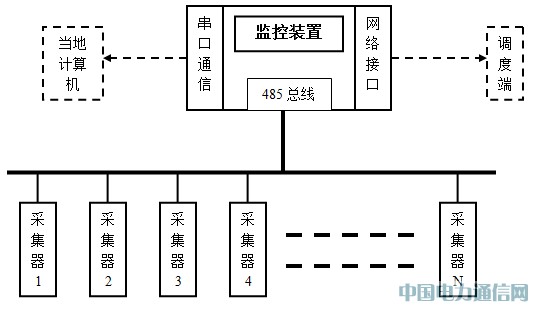 监控终端装置 通过RS485总线将电压采集器,开关量模块,母线绝缘监测模块,放电负载等设备连接到一起,将它们所有的信号收集到一起统一管理,并且可以通过光纤局域网端口或光端机空余串口将采集到的所有信息传送到中心服务器软件,服务器软件将信息存储管理并分发信息到每个相关管理岗位的计算机,并使其在局域网上每个计算机均可浏览到所有信息,提供分级的管理口令可对任意一个变电站的信息及参数进行更改并能提供相关的远程控制。同时负责本地数据的存储、实时显示、设置、表格、查询、报警等人机操作界面控制, 监控中心接收监控终端的数据进行分析处理。