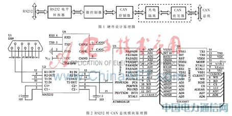 RS232接口端信号经过RS232电平转换成TTL电平,直接输入到微控制器的通用同步/异步串行接口(USART),微控制器控制CAN控制器读出有效的数据经光电隔离的CAN收发器发送到CAN总线上。