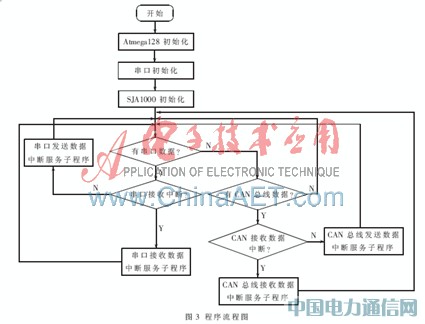 本设计程序主要包括:串口初始化程序、SJA1000初始化程序、单片机接收串口中断服务子程序、单片机发送数据到串口中断服务子程序、单片机接收CAN数据子程序、单片机发送CAN数据程序以及一些异常错误处理子程序等等。程序流程图如图3所示。