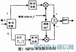 QPSK调制由于同相支路I和正交支路Q的两个比特ab可能同时发生变化,因而存在180°的相位突变,这在频带受限的系统中会引起信号包络的很大起伏,造成邻道干扰。OQPSK调制对此作了改进,它将Q支路的符号在时间上错开Tb,这样上下两个支路的相邻码元不可能同时变化,使得相邻码元相位差最大缩小至90°,从而减小了信号包络的起伏。OQPSK调制的原理如图1所示。