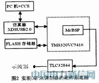 OQPSK调制器的硬件开发平台采用的是合众达的SEED-DEC5416嵌入式DSP开发板,其系统结构原理如图2所示。处理器是16bit定点DSP芯片TMS320VC5416,OQPSK信号的16位各样点数据送往转换精度只有14位的D/A转换控制器TLC32044,该控制器只对16位中的高14位数据进行D/A转换,转换后的波形送示波器显示。