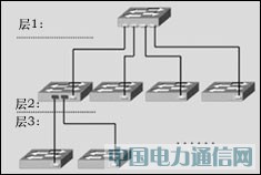 现在的级连扩展模式综合考虑到不同交换机的转发性能和端口属性,通过一定的拓扑结构设计,可以方便地实现多用户接入。级连模式的典型结构如图一所示。