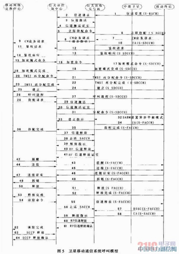 图4中信令的第一个字节属于标识头部分,高4位为传输标识,低4位为协议标识,用来区分使用不同协议的信令。第二字节标识信令类型,剩余字节为具体的信息单元。这些信令在移动通信过程中主要完成呼叫、位置更新、信关站间及内部的切换、定向重试、短信息等业务。在卫星移动通信系统中使用的上述基本流程与陆地蜂窝GSM系统的流程类似,但由于使用卫星作为中继,信号传播延时大,又其特殊性,比如呼叫重建功能不再适用本系统,利用卫星中继的优势在信令巾增加了GPS信息等。针对移动通信系统,设计呼叫模型如图5所示,其流程主要是,移动终端首先发出信道请求命令,中继卫星接收到信号之后进行透明转发,将信令转发给信关站,信关站控制中心对信令进行分析对移动用户做出响应,并向地面网中的被呼叫用户发出命令,被呼叫用户接收到命令后做出响应,并发出相关请求命令给信关站的控制中心,通过卫星中继转发给地面发出呼叫的移动用户,经过一系列的请求、命令与响应之后,最终在呼叫用户与地面网的被呼叫用户之间建立连接,连接完成之后,进行呼叫进程。