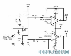 图中数字模拟转换器的输出端可采用在LMH 6643芯片中的一对放大器作为差分缓冲放大器,提供LMH 6643与LMH6672之间的低通滤波器的阻抗匹配、绝缘及驱动。图 2 的电路图显示所采用的SPICE模型。图中的反相缓冲放大器的电压增益定义为 -RB1+/RB2+和-RB1/RB2。