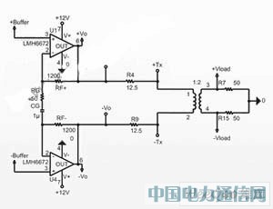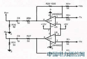 由于LMH6622的噪声及失真率较低,因此可用作下行链路的低噪声前置放大器。低噪声及低失真率这两个优点可确保接收通路具有很高的动态范围,以满足 ADSL标准有关线性度及噪声的严格规定。图4的LMH6622芯片可以实现反相加法放大器的功能,以便提供接收前置放大器通道增益,并消除驱动器的回波信号。为了消除接收通道上的驱动器回波信号的干扰,R1+必须设定为2×R2+,而 R1-也必须设定为 2×R2-。实际应用中,由于信号匹配并不理想,因此混合抑制约为12dB。在仿真时可以改变电阻值,以便测试出接收电路的真正性能。