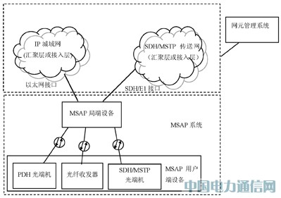 MSAP系统通过SDH接口或以太网接口与SDH/MSTP传送网或IP城域网相连;通过E1,10/100BASE-T接口或V.35接口和客户设备相连。