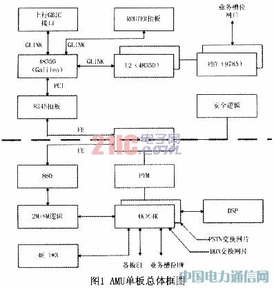 宽带数据部分CPU系统采用Motorola的8245 CPU系统,对外提供一个32位的PCI接口和LOCAL BUS接口。PCI总线可支持5个设备,8245通过PCI总线可对GALILEO48303进行配置,再通过GALILEO公司定义的GUNK总线实现对各业务网口、上行千兆光口、路由模块的数据交换。AMU单板总体框图如图1。