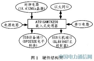 该系统硬件设计是由电源、复位、时钟电路、以太网口、USB主机和设备端口以及串口组成,其结构框图如图1所示。其中,以太网口用于将设备接入网络实行远程管理和监控。将设备的数据接入Internet,实现远程监控,适用于工矿企业设备的集中化管理和维护。USB主机端口通过主机控制器SL811HS/T与控制器AT9lSAM7X256相连,进行数据通信。USB设备端口作为与PC机通信的接口。该系统设计的创新在于该设备抛开了PC机,既可作为主机,也可作为外设,并与其他0TG设备直接实现点对点通信。