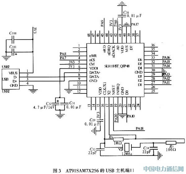 AT91SAM7X256的USB主机端口原理图,如图3所示。SL811HS/T选用48引脚的TQFP封装形式,SL811HS/T既能用作Host模式又能用作Slave模式。将SL811HS/T的M/S引脚接地,即设为低电平信号(M/S=0),选择作为主机端口。