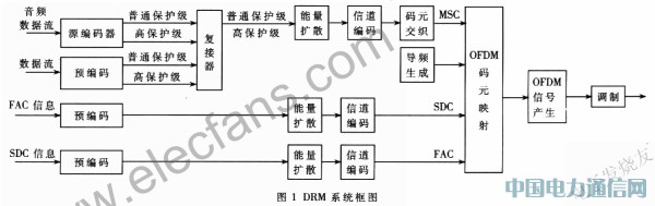 DRM系统框图如图l所示,主要由三个逻辑通道组成:主业务通道(MSC)、业务描述通道(SDC)和快速访问通道(FAC)。