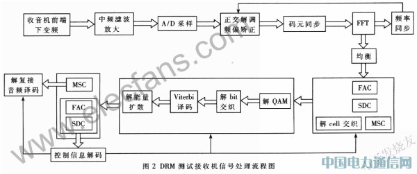 按图2所示流程,从均衡后的数据中提取FAC单元并将其解码,得到解调SDC的信息;再提取SDC单元,根据FAC的信息解码SDC,得到SDC数据实体;最后提取MSC,根据FACSDC的信息解码MSC。上述单元分别经过解交织、解OAM映射、Viterbi译码、能量解扰等模块的处理后,最后将MSC解复接后的数据进行音频译码或者数据解码。
