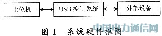 整个系统的硬件框图如图1所示。可以看出USB控制系统在整个系统中起到桥梁作用,用于连接上位机和外部设备。