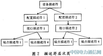 描述符主要是让上位机了解USB功能设备的基本配置信息和能力,如端点、接口等。在此主要使用标准描述符来说明USB设备,如设备描述符、配置描述符、接口描述符、端点描述符、设备限定描述符等。在该设备中,这些描述符的层次结构如图2所示。