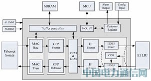 RAYCOM的EoPDH芯片族为广大设备制造商的转换器互通及业务质量保障提供了更加有竞争力的解决方案,芯片的功能框图如图1所示。同时,RAYCOM的EoPDH芯片还具有如下特点: