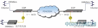 通过1-16路E1传输以太网信号,穿越传输网,实现点对点的以太网业务互通。