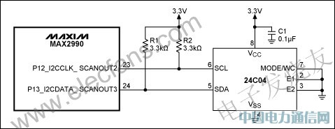 本文介绍了如何通过MAX2990电力线通信调制解调器的I2C接口与外部EEPROM 24C04连接,并给出了相应的固件例程。I²C总线受控于MAX2990 (主机),24C04 EEPROM为从机器件。以下框图给出了本文示例的硬件配置。