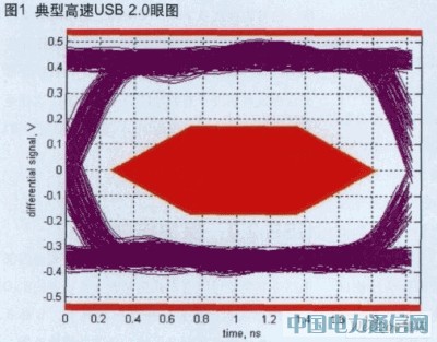 为了理解信号带宽的要求,应要界定信号完整性的衡量方法,一般的做法是衡量信号的眼图(eye diagram),确定接收到的信号的质量。眼图显示信号在不同状态之间转变,表明接收器能够接收(interpret)正在传输的数据的表现有多好。高速数据传输方案在眼图方面拥有信号必须符合的特定遮罩(mask)或模板(template)。典型高速USB 2.0眼图(含遮罩模板)如图1所示。