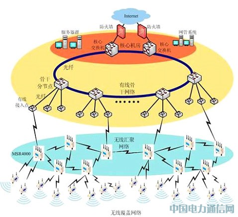 无线Mesh网络内部通过无线方式互连,在有线落地点通过光纤接入到有线网络中,所有Mesh设备可以同时提供无线覆盖,为各种无线应用提供服务。无线网络整体架构如图: