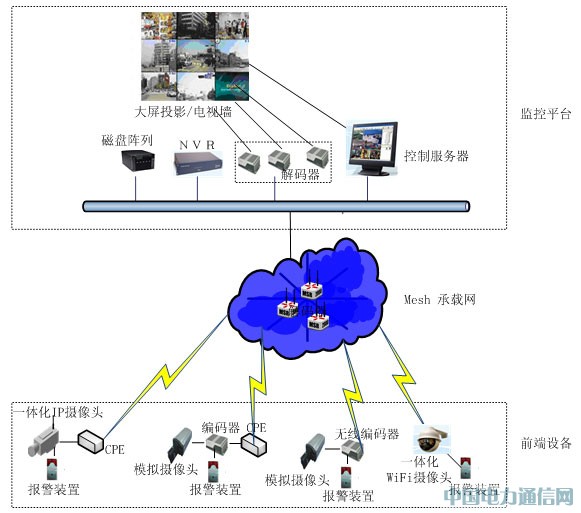 无线视频监控网络主要包括视频监控、Mesh承载网和其他辅助设备三大部分。根据具体需求的不同,可以灵活的组合。无线视频监控架构如下图所示: