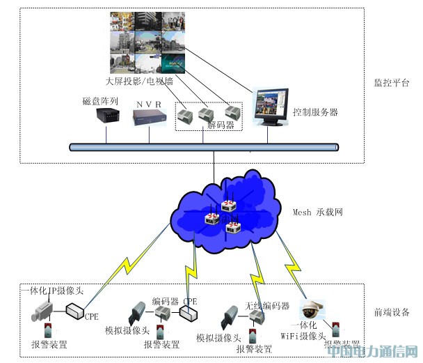 无线视频监控网络主要包括视频监控、Mesh承载网和其他辅助设备三大部分。根据具体需求的不同,可以灵活的组合。无线视频监控架构如下图所示: