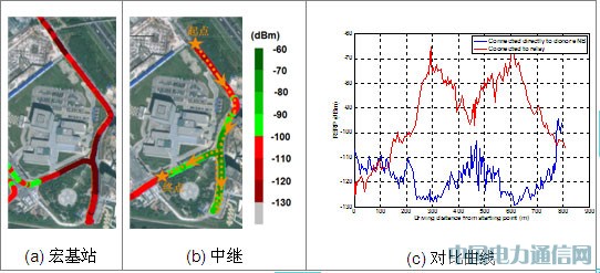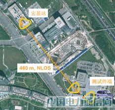 爱立信和中国移动携手于2011年上半年针对该中继测试床进行了联合外场技术试验。试验中各节点(宏基站,中继的终端部分及中继的基站部分)均为两天线;中继和宏基站之间的距离约为460米,中间有建筑物阻挡;站点部署及天线方向如图 4所示;测试终端为LTE版本8的Aeroflex TM500(第三方终端)。