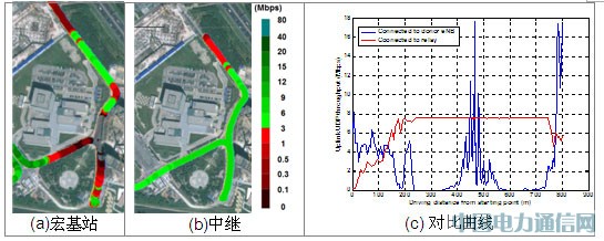 图 5,图 6和图 7分别给出了RSRP(Reference Signal Received Power)、上行吞吐量、下行吞吐量在有中继和没有中继情况下的对比结果。从测试结果可以看出,通过在宏基站覆盖边缘安装中继,在宏基站的阴影覆盖区,RSRP从-125 dBm提高为-70 dBm,上行吞吐量从0提高到接近8 Mbps,下行吞吐量从0提高到20 Mbps左右。图 5 - 图 7中(c)图的起点和终点位置如图 5(b)中所示。下行速率只能达到20 Mbps,原因是回传链路只能支持20 Mbps的速率,从而成为系统的瓶颈。