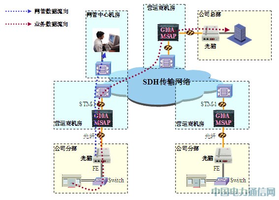 在客户的末端点(一般是公司的分支机构)部署光纤收发器,将对接客户的的数据设备。光纤收发器通过光纤与营运商机房的G10A型MSAP设备对接。在营运商机房部署的G10A型MSAP设备完成分支机构数据业务的GFP封装,并将业务映射进VC容器,进入SDH网络。在中心点(一般为营运商中心机房)部署G10A型MSAP设备,还原相关的数据业务,并与公司总部的光纤收发器对接,将相关数据业务传送至总部内网。