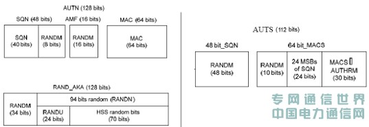 下图为规范中设计的AKA认证交换中AUTN及RAND的格式,以及同步传递RANDM中AUTS的格式