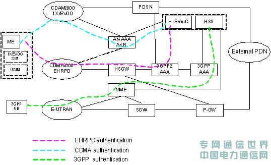 下图给出了CDMA2000与LTE/EPC的互操作网络架构。同时示意了接入三种网络即CDMA2000现网,CDMA2000 eHRPD过渡网络,以及LTE网络进行用户鉴权时各自网络节点的构成。