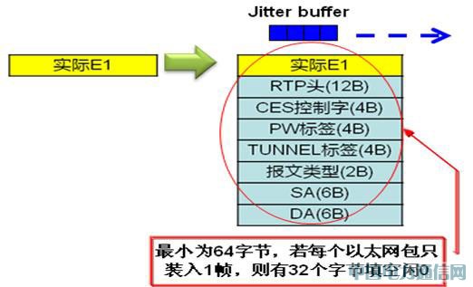 上图是E1做PWE3的过程。按照标准中定义,在收到的E1数达到jitter buffer一半后,才向外发送。通常每ETH包中封装4帧E1,如果jitter buffer配置为250us(各厂家正常配置一般为100us-4ms),单节点延时约为1ms。对于MSTP技术,E1 映射到VC12 延时小于50us,单节点时延约为100us。