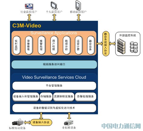高新兴通信最新推出基于云计算的C3M-Video视频监控管理平台,具有视频监控管理平台的通用功能和业务流程,能支持国内外主流的视频设备。此外,能与高新兴现有的动力环境监控系统进行深度的融合,并以此为基础逐步演绎成一个支撑物联网应用的融合监控平台。