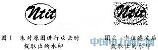 加入水印后的图像的水印不可见性可用峰值信噪比PSNR来测试。在λmin取0.2和k取0.5时,实验测出的峰值信噪比PSNR=43.0231,这个值表明了图像在嵌入水印之后的透明性是比较好的,从视觉的角度也可以看到,图像没有任何可见失真;另外,在没有任何攻击下,水印可以完全准确地提取出来(见图1)。