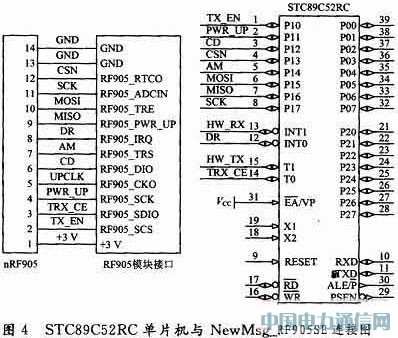STC89C52RC单片机与单片射频收发器nRF905连接如图4所示。