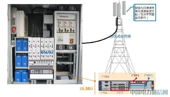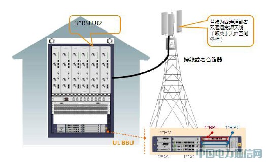 上图是UL双模都是中兴提供的多模基站,采用多模BBU,只有基带处理板(LTE基带板为BPL, UMTS基带板为BPC)是分开的,其他的主控板(CC)、电源模块(PM)、环境告警板(SA)全部共享,再插入3个支持LTE的RSU82射频单元,后续UMTS的射频单元如果要平滑演迚到LTE只需要软件升级即可(同频段的条件下)。
