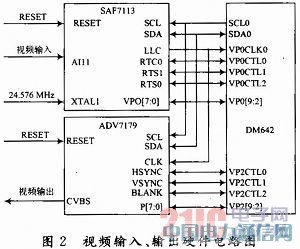 DM642集成了3个可独立配置的视频口VP0~VP2,非常适合于图像处理系统方面的应用。本设计中,将DM642的VP0口配置为视频输入模式,VP2口配置为视频输出模式。硬件电路如图2所示。
