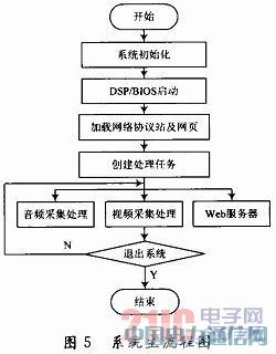 由于DSP/BIOS为多任务操作系统,将整个系统的处理分为3个部分:音频采集与处理任务、视频采集与处理任务、HTTP服务任务。软件的整体流程如图5所示。