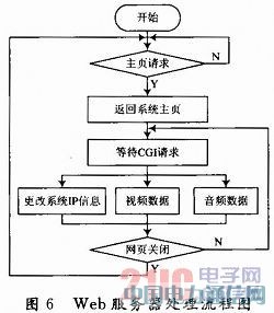 Web服务器的处理流程如图6所示。系统网页设计采用HTML语言,在系统启动时将主页加载到RAM,用户在PC端通过浏览器输入系统IP地址,Web服务器返回系统的主界面。网页和服务器之间的数据交互是通过表单的形式,CGI处理程序提取表单中的有用信息,实现对系统IP信息的配置、视频音频编解码芯片的参数配置等,并将视频音频编码后的实时数据以表单的形式传输至用户浏览器,实现系统的远程监控功能。