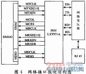 DM642带有一个EMAC接口,符合IEEE802.3协议,具有8个独立的发送与接收通道,支持10Mb/s或100Mb/s模式。本设计中,采用Intel公司专门开发的一款以太网收发器LXT971A。LXT971A采用先进的CMOS工艺,只需一个3.3V的单电源供电,其MII接口(独立多媒体接口)可与DM642的EMAC接口直连。LXT97IA的4路信号TD+,TD-,RD+,RD-经过网络变压器转化后接到RJ45连接器上。模块结构如图4所示。