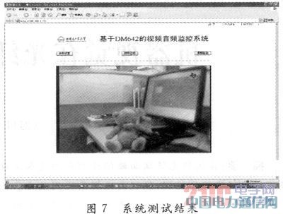 在集成开发环境CCS(C6000)下,加载相关驱动程序,对本系统进行了测试。CCD摄像头为标准PAL制式,图像采集的帧频为25帧/s,图像的分辨率为720×576像素。测试结果如图7所示。测试结果表明,网络连接正常,用户在PC端可通过浏览器访问系统,成功实现远程监控。
