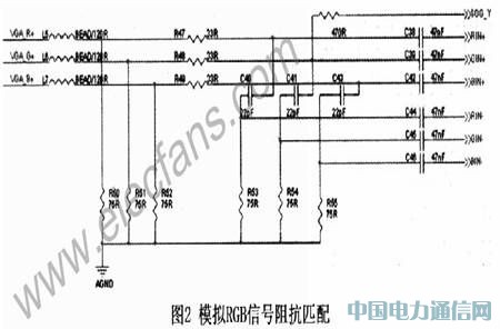 模拟视频信号输入都需要对地进行阻抗匹配,如图2为模拟RGB输入阻抗匹配电路,输入信号先通过一个120R的磁珠隔离高频噪声,然后进行75Ω对地阻抗匹配与35Ω输入阻抗匹配,靠近芯片端放置47nF陶瓷电容耦合输入。对于CVBS同样需要进行对地阻抗匹配与输入阻抗匹配,典型值为62Ω或75Ω,耦合电容可以选用0.1μF陶瓷电容。