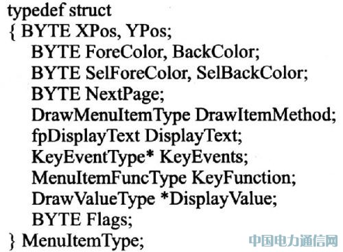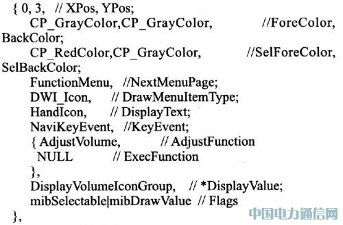 Maria提供了一个标准的OSD菜单框架,主要包括色彩、对比度、亮度、屏幕显示区域调节、定时关机等。Maria OSD菜单包含有三级菜单,一级菜单根目录root;二级菜单包含图像、音量、功能、系统、时间共5个目录;三级目录即各二级目录内部菜单项,如图像菜单下含有亮度、色度、对比度、语言等四个三级菜单。用户可以自己添加和删除任意级别菜单,本系统中选择PT2314音效处理芯片,支持四通道立体声输入,主机可以通过I2C总线对音量、低音、高音、平衡等选项分别进行控制,故在音量二级目录下建立音量(Volume)、低音(Bass)、高音 (Treble)、平衡(Balance)四个三级目录。MenuTbl.h文件中建立对应的菜单数组MenuItemTypecode AudioMenuItems[]={):其中MenuItem-Type是个数据结构,其原型为包含有菜单项的相对位置、背景色、被选中时颜色、关联的下一级菜单、菜单描绘类型、显示文本、按键对应事件、功能、显示类型、标志等。各项意义基本上可以由文字描述理解,需要注意的是MST717C OSD菜单只支持16色显示。此处以PT2314一个子菜单为例展示。