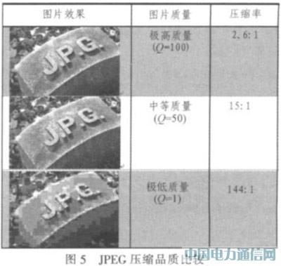 而目前普遍采用的802.11g Wi-Fi标准,其标称速度只有54Mbps,并不能满足以上所需的数据带宽。所以需要对数据经行压缩。在1280x800的分辨率下,压缩率需要在5:1以上,可以考虑选用JPEG标准。JPEG压缩品质比较如图5所示。