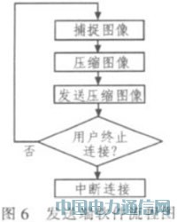 该系统的发送端软件基于windows设计。其实现的主要功能可以概括为:采集当前屏幕显示图像,压缩图像,传送经压缩的图像。发送端软件流程图如图6所示。